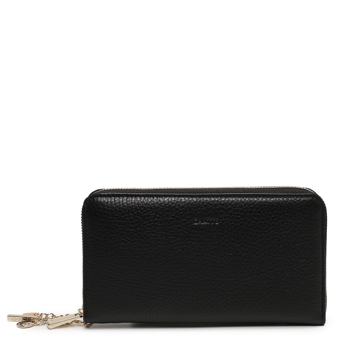 Закрывается на молнию. Внутри три отделения для купюр, разделенные карманом на молнии для мелочи и перегородкой, два открытых кармана и кармашки для пластиковых карточек.